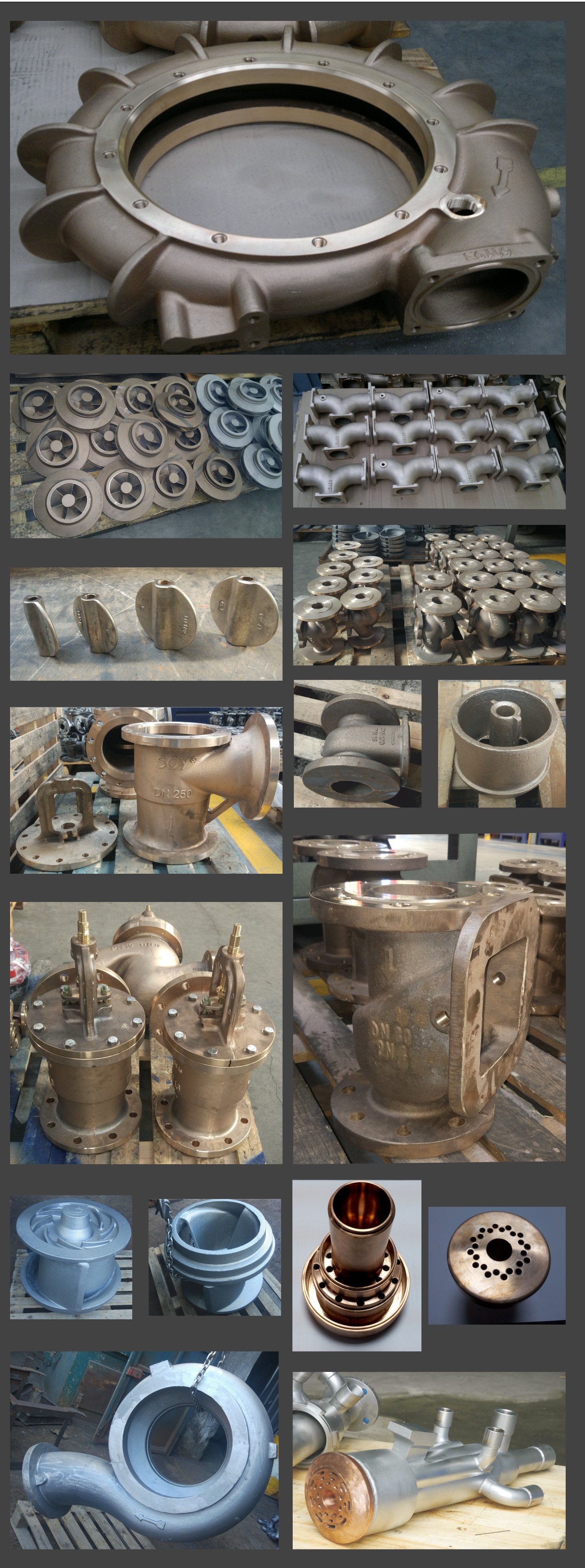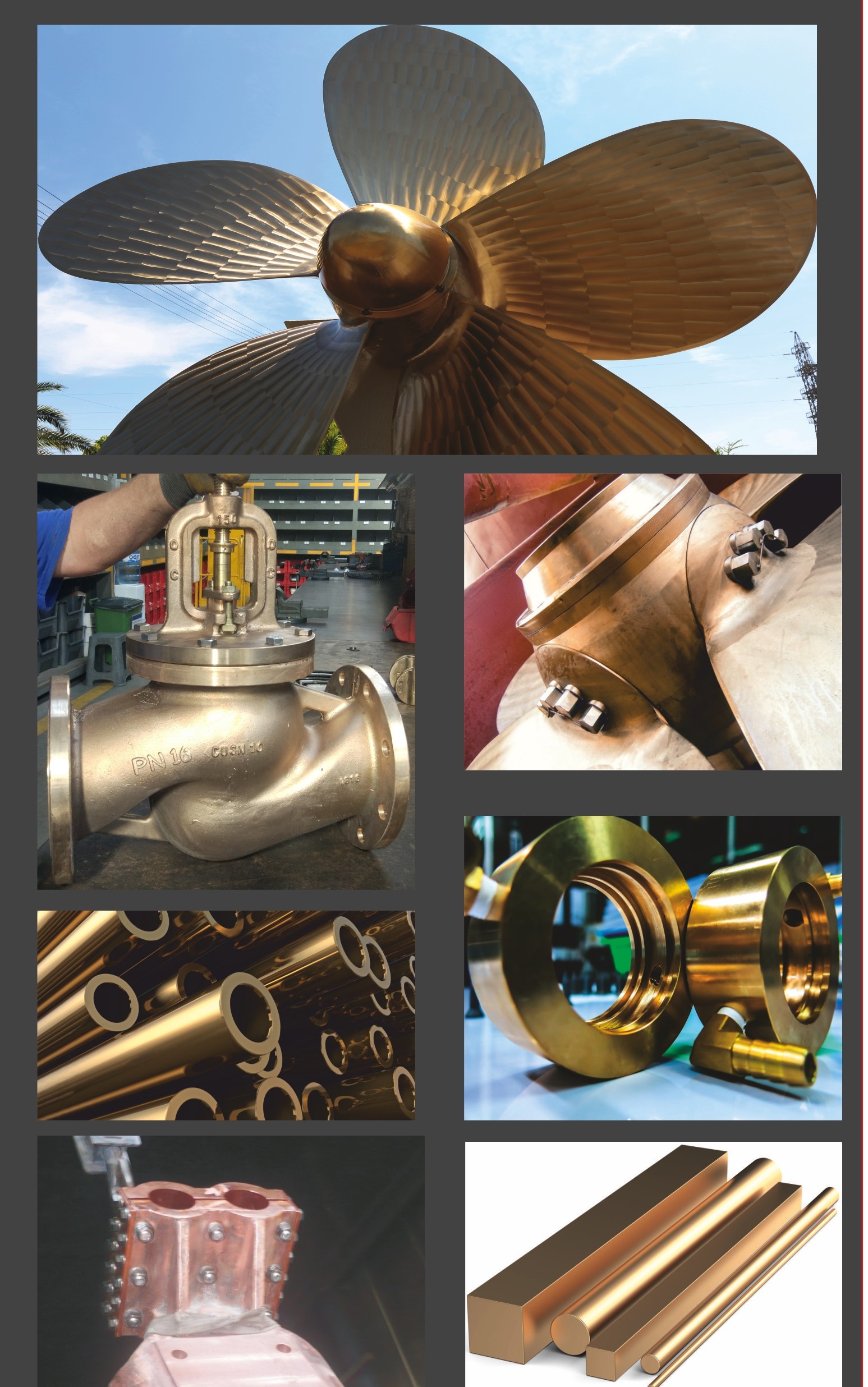 , Cu, CuCr, CuCrZr, Aluminum Bronzes, Nickel Aluminum Bronzes, Manganese Bronzes, Tin Bronzes, Leaded Tin Bronzes and Stainless Steel Alloys are manufactured by the Model casting, Continuous casting, Sand casting, Die casting, Centrifugal casting, Forged and Extrusion. Our products are Ship propellers, Valve Bodies & parts, Pump Bodies & parts, Flanges, Pipe Fittings, Bedding, Bearings, Electrode Holders, Cooling Blocks, Burners, Burner systems, Oxygen & Carbon Lances, welding construction parts consisting of a combination of copper and steel materials,